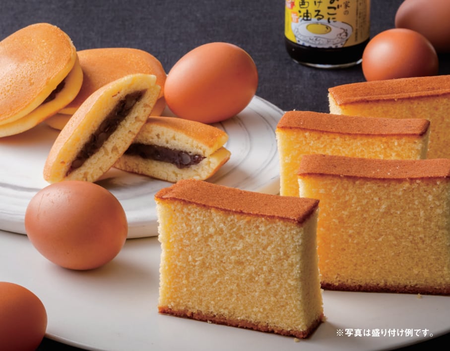 天心山の卵をふんだんに使用したカステラとどら焼きのセットです。